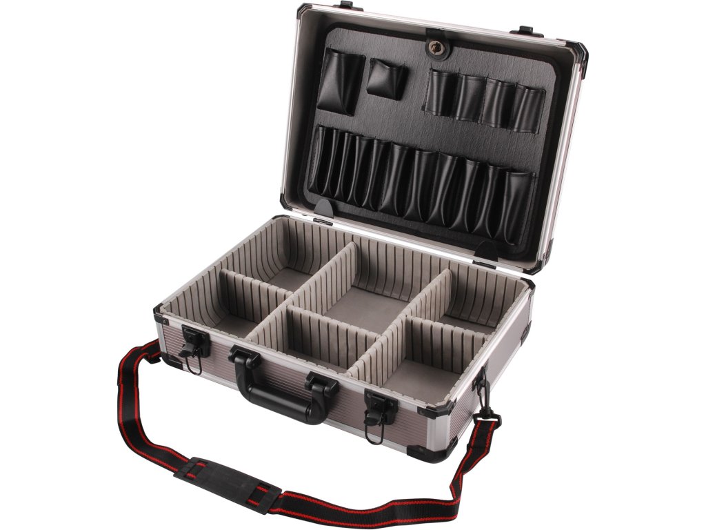 | doplňující parametr: | šedohnědá barva, přepážky uvnitř kufru lze přenastavit nebo úplně vyndat, látkový panel se 17 kapsami na nářadí usnadňuje organizaci nářadí v kufru |