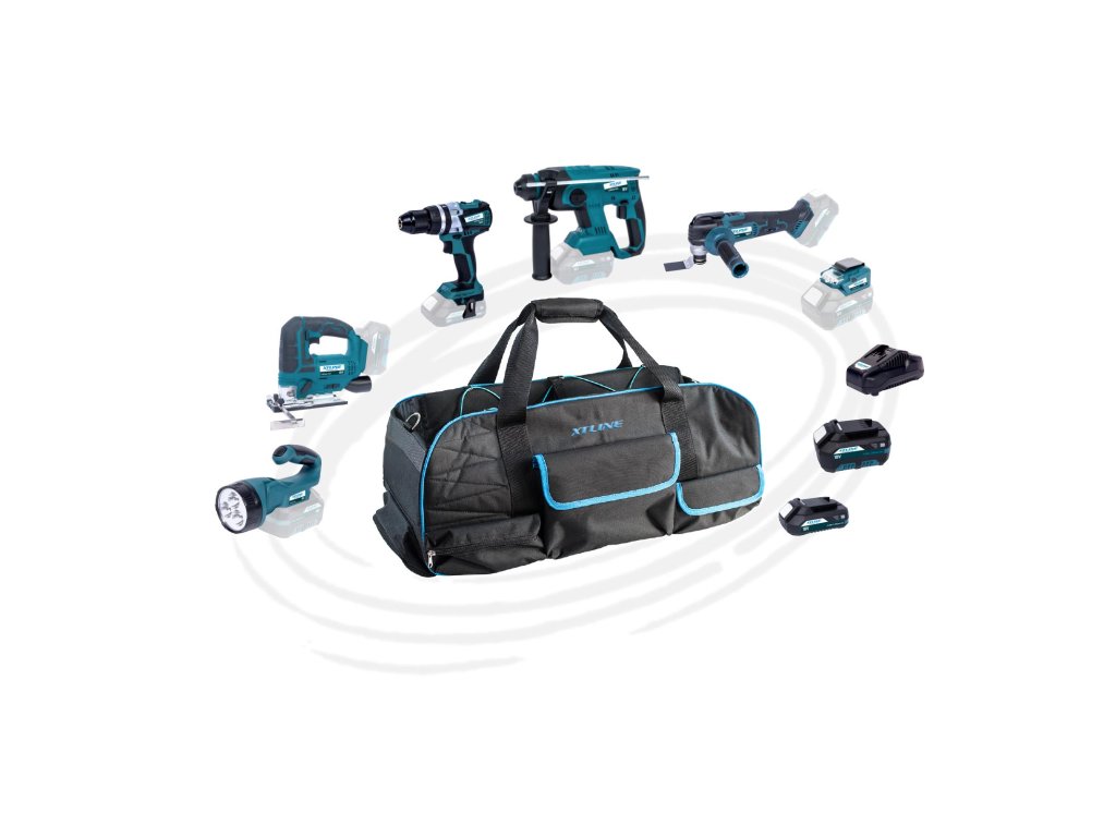 Sada aku nářadí XTLINE obsahuje, aku pneumatické kladivo, aku vrtačku, aku oscilační brusku, aku svítilnu, aku nabíječku, 2x baterii 18 V 2.0 Ah, 1x baterii 18 V 4.0 Ah a nabíječku. Všechna zařízení jsou vybavena protiskluzovým měkkým držadlem pro ergonomickou a bezpečnou manipulaci. Systém akumulátoru XTLINE poskytne dostatek energie pro celou řadu akumulátorového nářadí XTline. Jednou baterií totiž můžete pohánět všechny produkty setu.Doplňkové parametry