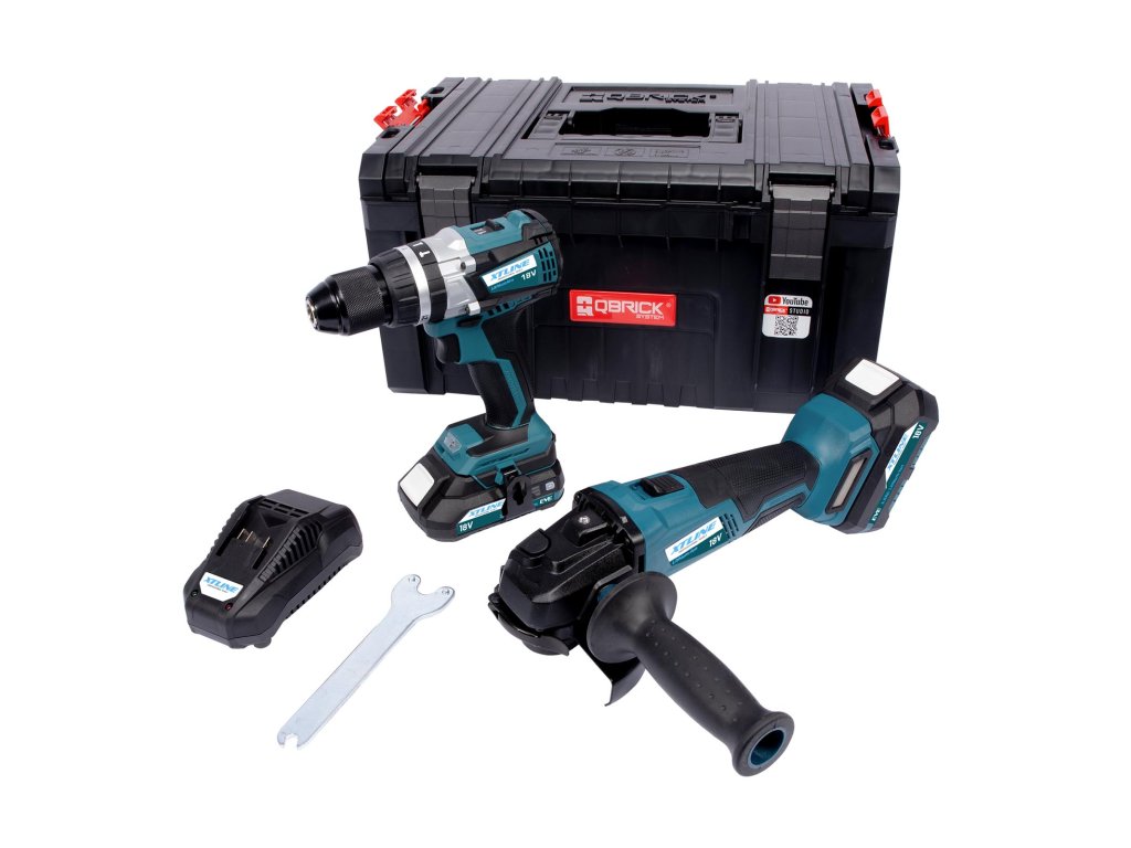 Sada nářadí XTLINE obsahuje, aku úhlovou brusku, aku vrtačku (příklepová), nabíječku baterie, 1x aku baterii Li-Ion 18 V, 4.0 Ah, 1x baterii Li-Ion 18 V, 2.0 Ah a plastový box QBRICK. Všechna zařízení jsou vybavena protiskluzovým měkkým držadlem pro ergonomickou a bezpečnou manipulaci. Výhodou bezúhlikového motoru je vyšší životnost, větší výkon/točivý moment, nižší hmotnost a bezúdržbový provoz. Systém akumulátoru XTLINE poskytne dostatek energie pro celou řadu akumulátorového nářadí XTLINE. Jednou baterií totiž můžete pohánět všechny produkty setu.Doplňkové parametry